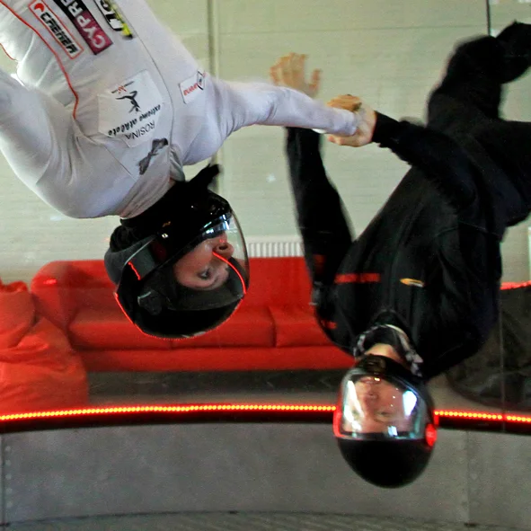 SPORT FLIGHT If you like to use sport products, it is necessary to have an activated registration for sport flying. For the activation you must proof you already have minimum of 30minutes tunnel flying experience at INDOOR SKYDIVING PRAGUE or any other wind tunnel all over the world. Sport flight means that you can practise flying on your own and there will be just one safety instructor in the door to the flying chamber, or you can hire a professional coach, who will illustratively show you what to do and guarantee the best progress for you! ;) Each participant have their own equipment or can rent the equipment at our wind tunnel. Experienced flyers can use the full output of and fly at speeds over 300 km/h. Less experienced flyers can use prepared programs that lead to improvements in skills and techniques under the guidance of our experienced coaches. Sport training in the windtunnel is suitable for starting skydivers and for the experienced skydivers as well. All you learn in the safe atmosphere of the windtunnel will be ready to use in the sky with the parachute on your back! Experience what it feels like to fly in the only circular glass flight chamber in the world!